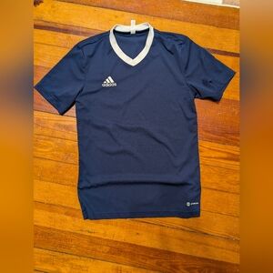 Stylish Adidas jersey in dark blue with white trim. Ideal for sports and casual wear. Soccer futbol style. Size S. Unisex.