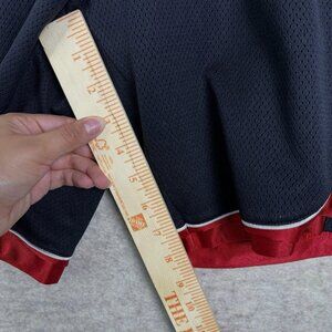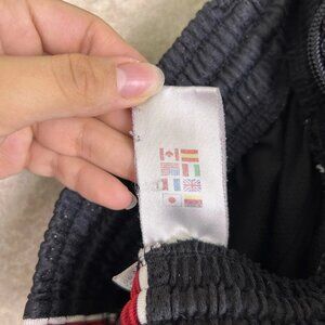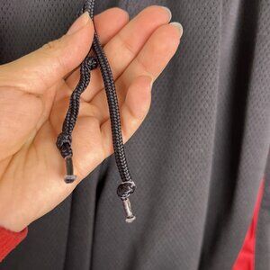 Pre-owned condition, has loose fibers on the red fabric, scrunched up at the bottom, and one of the drawstrings are curled up. ( see photos ) recommend a wash before wear.