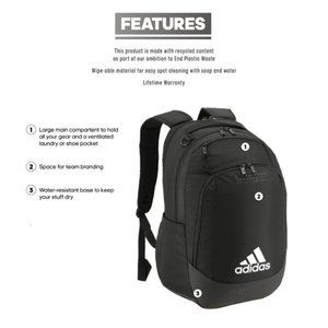 Your schedule is non-stop. But not to worry, everything you need is at the ready in this adidas backpack. A ventilated compartment keeps wet shoes or muddy clothes separate from books or papers. Side pockets hold your water bottles.