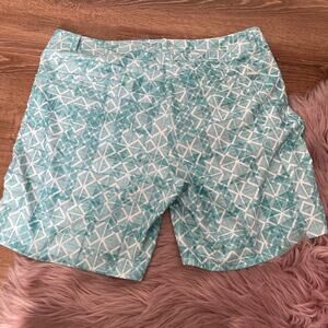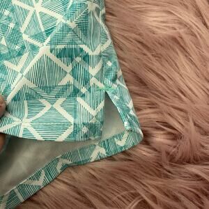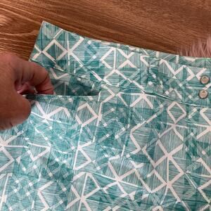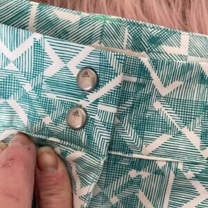 EUC are a pair of green and white geometric print shorts by Adidas. These have a double snap and zip front with side slash pockets. The outer sides has small slits. Backside has two flat hidden pockets.