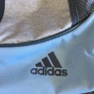 Blue and gray Adidas drawstring backpack. Used a few times. Drawstrings are gray and very comfortable. Lots of storage space with a zipper pocket on the front side.