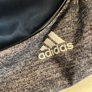 Adidas Drawstring backpack with navy blue, green teal and pink accents. Front zipper pocket w a fleece/soft interior for glasses or other fragile items.