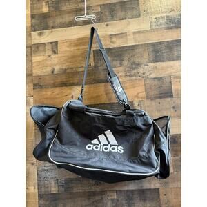 Adidas Duffle Bag- Black. Classic and functional this duffle features a roomy main compartment and side storage pockets, with the iconic 3 stripe logo. Perfect for the gym, sports, or getaways. Great condition, gently used, and ready for all your adventures. Great value!!