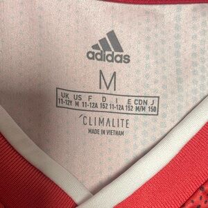 Bold red Adidas Soccer jersey with sleek design. Perfect for sports and play. Comfortable fit.