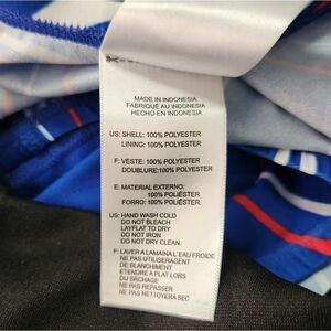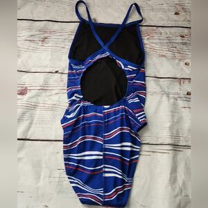 Adidas one piece swimwear. Adidas logo solid infinitex vortex back. Cut out back with thinner straps. Blue, white, and red wavy stripe pattern.