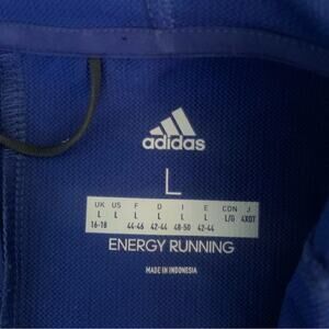 Energy Running jacket by Adidas. Size Large. Royal blue with grayish logo and details. Front zipper closure. 1 side pocket. Elastic hoodie. Lightweight. Wind protection. Weather resistant. For trails, runs, and hikes or everyday life. 68% polyester, 20% recycled polyester, and 12% spandex. Like new. Athleisure. Athletic. Outerwear.
