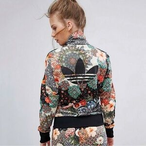 Adidas x FARM Rio Collection features a variety of prints, patterns, and textures inspired by the streets of Rio De Janerio, Brazil. An iconic cut meets an elaborate mosaic-like print with mandala floral graphics inspired by legendary gardens of paradise. The Jardim Agharta Trefoil Track Jacket features a full front zip, high neck collar, signature three stripe sleeves, zip pockets, banded cuff and hem.