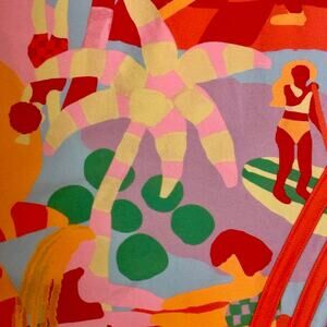 bright pastel style colors and fashionable resort beachy styling - print features palm trees and women and men doing different outdoor activities. Super cute!