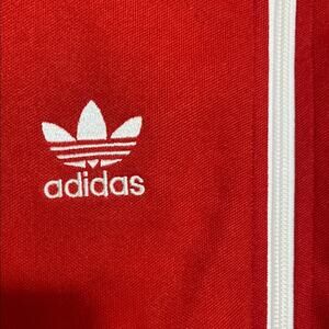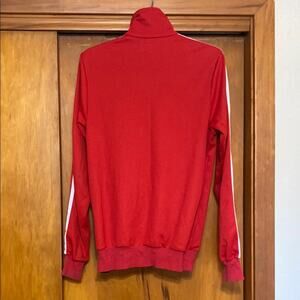 Stylish red track jacket featuring white stripes and Adidas logo. Perfect for casual wear. Streetwear German football soccer sporty style.