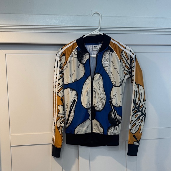 Vibrant Adidas jacket with floral design with Farm Rio. Features blue, white, and orange hues. Size 2xs