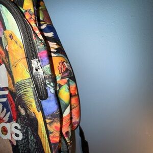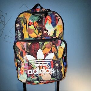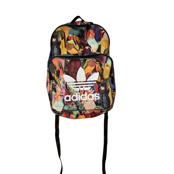 Adidas x Farm Rio Passaredo backpack. This is my favorite adidas farm collaboration print. Beautiful and stand out bag. Birds of paradise. Parrots, parakeets and more! Tropical bright colors. It does have some wear on the zipper and the lettering/logo. Please see pics. Again, there is bubbling/chipping to the white areas. The inside is clean and the rest of the bag is fine and vibrant. I’ve only seen one other of this bag for resale in the 5-7 years I’ve collected Adidas items. Rare & HTF.