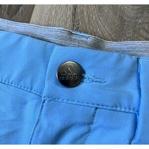 These Adidas Flat Front Athletic Golf Shorts in size 28 are perfect for a casual or travel occasion. Made of polyester/spandex microfiber fabric, they offer a comfortable stretch while maintaining a chino style. The powder blue color and solid pattern make them versatile for the summer, fall, and spring seasons. With a mid-rise fit and flat front design, these shorts feature a button and zipper closure, slash pockets, and are machine washable for easy care. The athletic fit and logo accents add a sporty touch to the preppy outdoor theme.