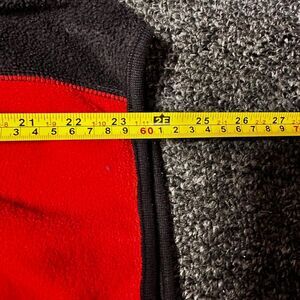 Condition: Good pre-owned vintage condition, minimal wear, no holes or stains. Red fleece body with black paneling and a bold yellow Adidas logo embroidered on the chest. Made in Mexico.