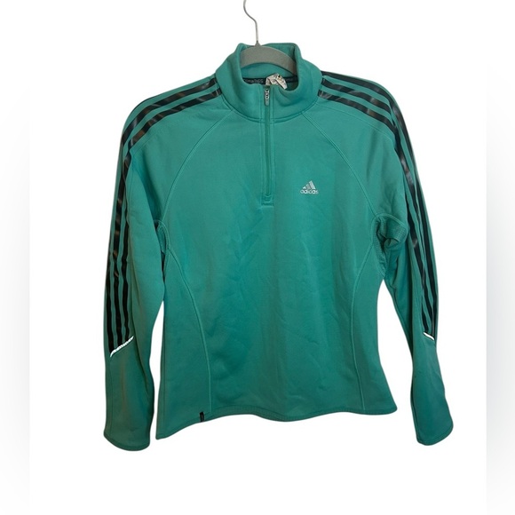 Pre owned excellent condition. Worn a handful of times. Really nice teal fleece lined quarter zip active top. Sleeves have adidas three stripes design. WOMENS size medium.