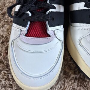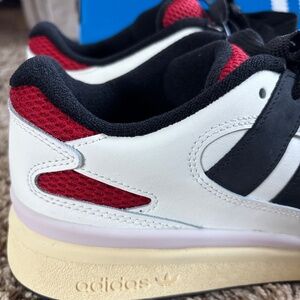 Add a timeless treasure to your sneaker collection with the adidas Forum2000. Bringing back the Y2K style with a pumped-up volume on the upper, these low-top basketball shoes let you hit the streets or break ankles on the hardwood with a flattering flair. A time machine on your feet, these unisex sneakers are highlighted with colour-blocking that harks back to the turn of the century. Make a statement on and off the court with the adidas Forum2000. adidas Forum2000 features: • Leather, suede, and mesh mix upper offers comfort and durability • Chunky laces look stylish and ensure a snug fit • Oversized stripes deliver a signature look • Rubber cupsole adds structure and street-ready appeal NEVER WORN/TAGS STILL ATTACHED COMES W/ EXTRA PAIR OF RED LACES