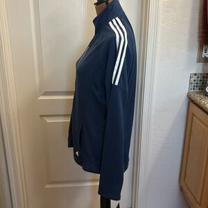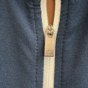 Adidas French Terry Full Zip Blue White Stripe Golf Jacket Size L NWT. Fitted silhouette with front side pockets.