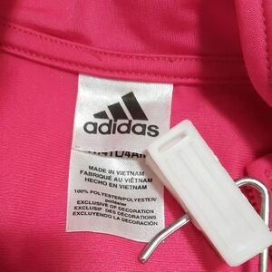 Vibrant fuchsia jacket with sleek black stripes. Adidas branding on the front. Perfect for sporty style.