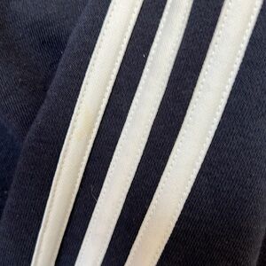 Adidas Men’s Full Zip Hoodie Jacket. Navy with Three White Stripes on Arms. Cotton/Poly blend fleece. Moderate fabric weight. Style GK9053.