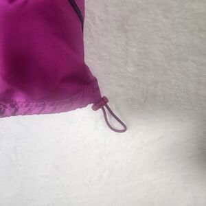 Has 3 black stripes in back with venting. Perfect windbreaker. Has elastic at bottom to cinch to form fit. see picture. Mesh lining - see pictures