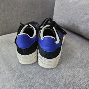 Sleek Adidas Gazelle sneakers with black suede and blue accents. Features iconic stripes and cushioned sole.