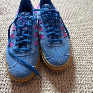 Bold Adidas Gazelle sneakers in blue and pink. Features a distinctive platform sole. worn once, no flaws