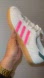 Stylish Adidas Gazelle sneakers for women. Features a white base with vibrant pink stripes. Tan sole adds a classic touch. Rhinestone stripes on the outside stripes.