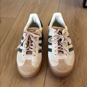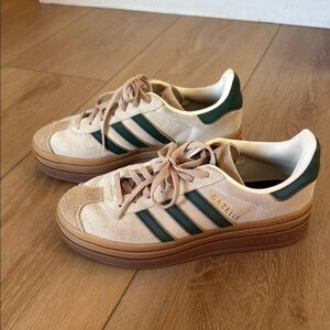 Adidas Gazelle sneakers with a beige upper and dark green stripes. Classic design with a comfortable fit.