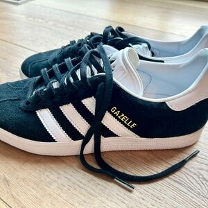 Adidas Gazelles in black suede with white stripes. Super comfortable, wore a couple times. I just don’t reach for them really because I don’t wear black.