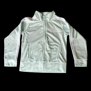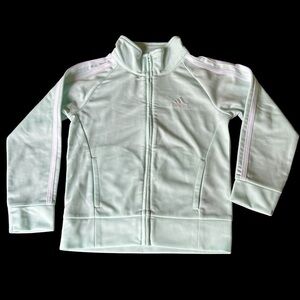 Adidas Girls 2 Piece Track Suit Mint Green Size 4 NWT. New soft track suit with 3 stripes and logo on jacket and pants. Pockets on jacket and pants. Lightweight 100% Polyester. Fresh iconic style. Adorable.
