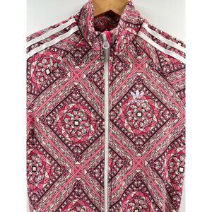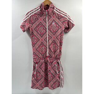 A stylish and comfortable romper for young girls, featuring a vibrant pink pattern, zippered front, and iconic Adidas stripes. Ideal for casual wear.