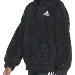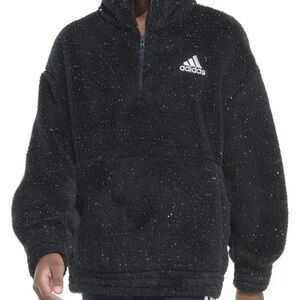 Cozy black fleece pullover with Adidas logo. Features a half-zip design.
