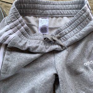 Very cute! Adidas sweat pants in pristine condition very stylish joggers. Light colored ash grey with white stripes. Almost new!