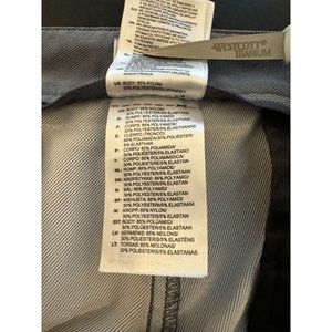 FLAW: tiny stain on bottom back of right pant leg (see photo)