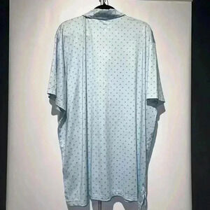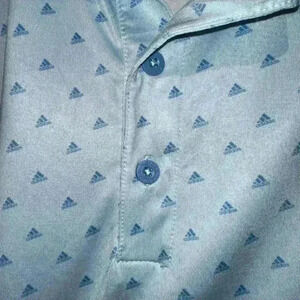This is a pre-owned Adidas Golf polo shirt in size 2XL. It is light blue with a small blue Adidas logo pattern all over. The shirt has a white Adidas logo on the left chest and a three-button placket. The collar is a traditional fold-over style. The shirt is made of a lightweight, breathable fabric. It is in good condition with no visible signs of wear or damage. The shirt has a tag that says "#0015120H" and "F5W14R1465". The shirt is made in Egypt.