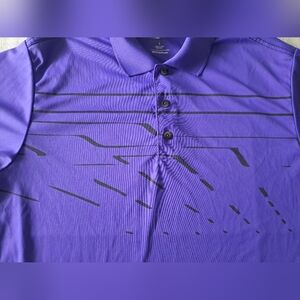 Performance golf polo in a bold purple color with modern black line graphic design across the front. Made with Adidas ClimaCool® technology for moisture-wicking comfort on and off the course. Three-button placket, short sleeves, and athletic fit.