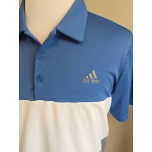 Men's Adidas Golf Polo Size L Short sleeve Colorblock Blue. White and Gray Measurement is shown