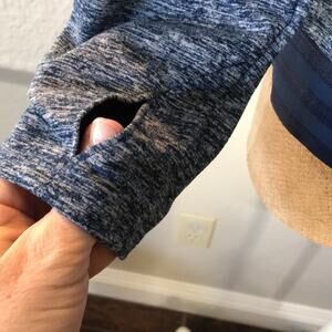 Thin blue pullover with thumb holes and deep quarter front zip.