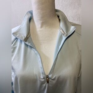 Light blue women’s golf 1/4 zip, collared, long sleeved women’s shirt size 2XL. Very thin, breathable material. Adidas logo on bottom front left side. Preowned.