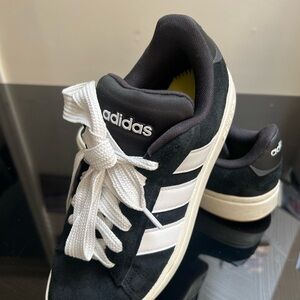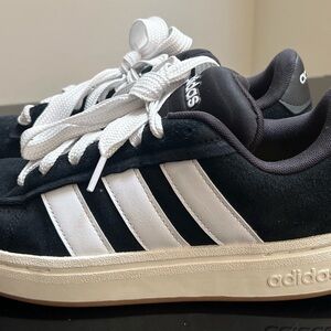 Sleek Adidas Grand Court shoes with a bold black and white look. Iconic stripes and comfortable fit. Gently used.