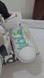 Stylish adidas kids sneakers. Features white base with pink stripes. Mint green laces add a pop of color. Comfortable and trendy design.