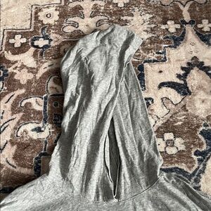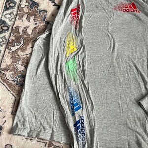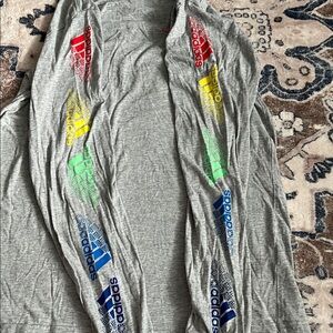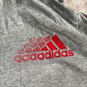 Stylish gray hoodie featuring a bold red Adidas graphic. Comfortable and trendy.