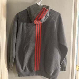 Cozy gray hoodie with bold red Adidas logo. Features a front pocket and hood. Perfect for casual wear.