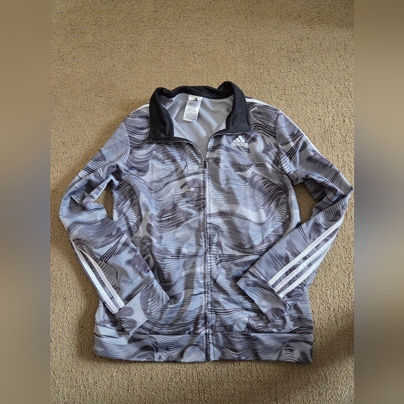 Stylish Adidas jacket with a unique gray pattern. Features a zip-up front and black collar accents.