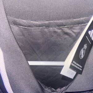 Stylish gray Real Madrid jersey by Adidas. Features club crest and sponsor logo. Comfortable and breathable fabric.