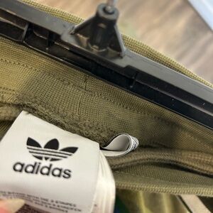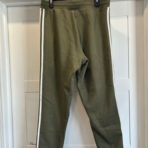 Stylish olive green track pants with white stripes. Features Adidas logo.