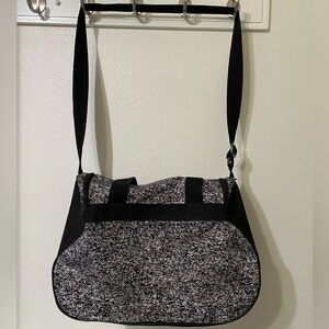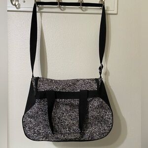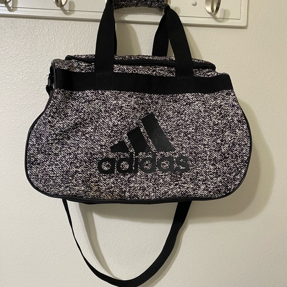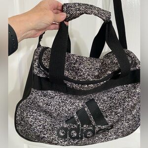 Lightweight Adidas gym bag or sports bag. Unisex. Perfect for sports equipment or gym clothes or travel. Wide opening top zipper. Adjustable shoulder strap. Also has handles. No tears. A few light marks inside. Excellent used condition. 18”across x13”tall x 10” wide