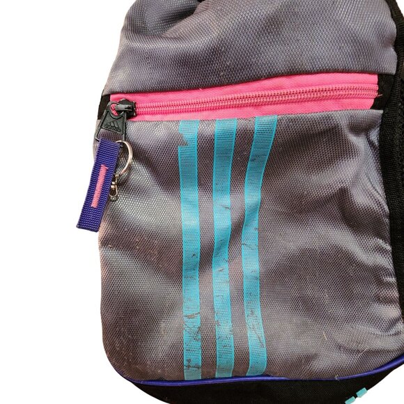 • Adidas Gym Sack Drawstring Bag Pink Ropes Black W/ Blue Stripes & Mesh Pockets Polyester