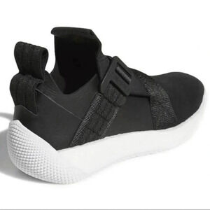Shoes feature a buckle-fasten cross strap system in place of traditional lacing structure, in addition to the BOOST midsole and grooved outsole overlay. Tongue features a flap that folds over and carries James Harden's signature "H" logo. These contemporary shoes embody a simplistic design, choosing to do away with patterned prints and excessive branding.