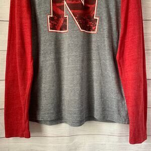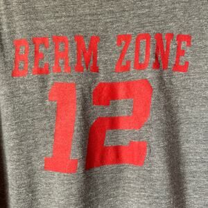 Heathered gray and red raglan long-sleeve t-shirt by Adidas. This baseball shirt has a Nebraska Cornhusker N on the front with an image of a baseball field imposed on it. The back says BERM ZONE and 12. It is pre-owned with very light, sporadic areas of pilling and very subtle cracking or wear to the front logo. Otherwise, it is in great condition.