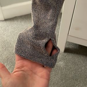 Thumbholes and adjustable at bottom. Great for running. Brand new, washed, never worn.